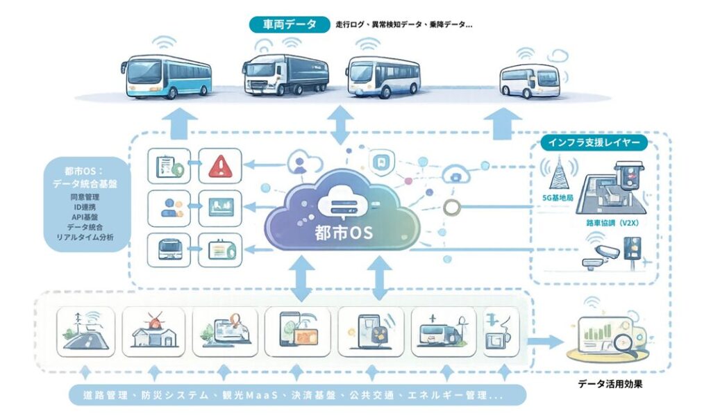自動運転の社会実装は、実はこの延長線上にあります。走行可否判断(天候・道路規制・渋滞・工事)をリアルタイムで“外部データ”に依存するほど、都市OSのデータ流通が効いてくる。